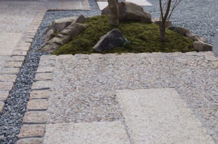 組合わせた雑木と砂苔ですっきりとした坪庭に仕上げました。自然石の景石を配置することによって、お庭の格を上げることができます。