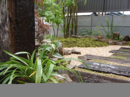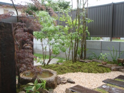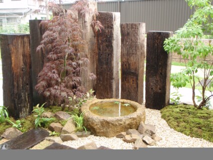水鉢と枕木を再利用して、和モダンなお庭に仕上げます。美しい雑木と砂苔と伊勢砂利のハーモニーでおしゃれな坪庭となりました。