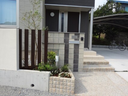 玄関の色と合わせたエバーアートウッドの角柱でモダンな門廻りを演出。植栽を配置して色のコントラストを楽しみます。