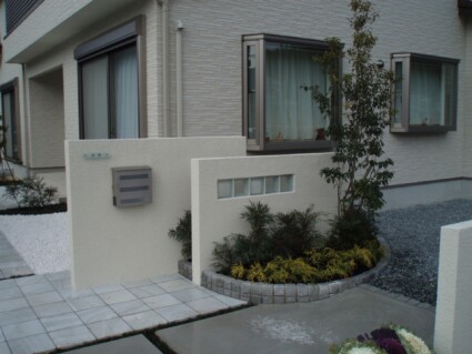 ピンコロ石で縁取られた花壇には、高木にソヨゴ、低木にマホニアコンフーサ・フィリフェラオーレを植栽しました。白を基調としたデザインなので、植栽のグリーンがよく映えます。