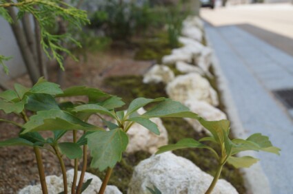 道行く人にも安らぎを与えてくれるような可愛らしいフッキソウを植えました。白い外壁にはグリーンの植栽がよく映えます!