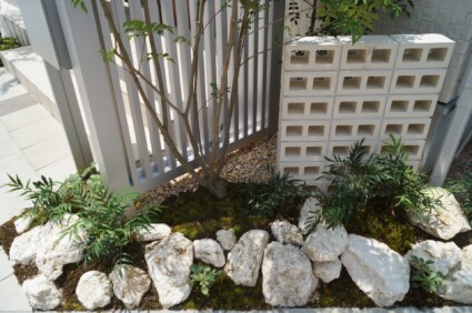 モダン外構の境界部分は、道行く人にも楽しんでもらえるようなフロントガーデンとしてデザインしました。土留め代わりに琉球石を配置し、リゾート感を演出しています。
