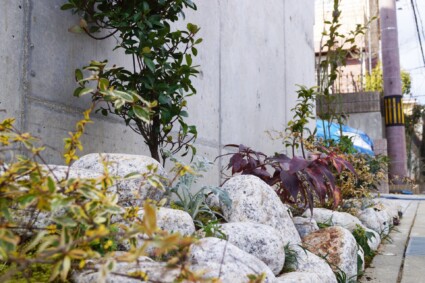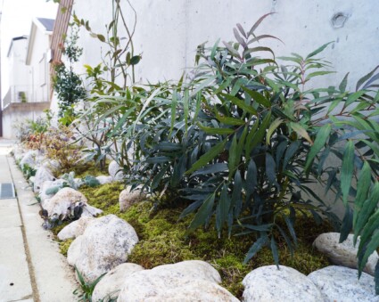 街並み協定部分の植栽帯には、レンガや土留めのブロックは使用せず、植栽と自然石でナチュラルなモダンロックガーデンをデザインしました!