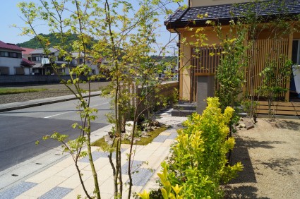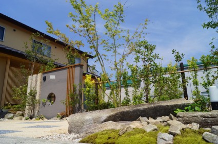 緑が豊かで心癒されるフロントガーデンが印象的な和モダン外構です