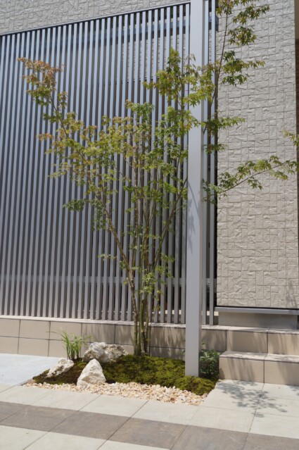 玄関先に設けた植栽スペースに、山モミジを植えました。足元には色鮮やかな砂苔と沖縄琉球石を配置し、明るい色の化粧砂利を敷きました。心安らぐモダンな空間の誕生です。