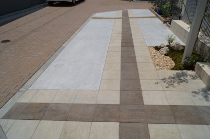 玄関までの距離が短いため、広く感じられようにして欲しいとのご要望で、玄関タイルに合わせたベージュ系のコンクリート平板に、ダークな色合いのクロスラインをアクセントで入れることにより、奥行きと広さを感じることができるようデザインしました。