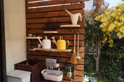 見せる収納棚には、大小さまざまな形の棚を取付けて、ガーデニンググッズを並べています。ガーデニングがご趣味の奥様には使い勝手のよい空間になりました。