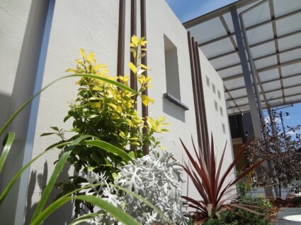 黄金マサキやニュウサイランなどの色合いがとても綺麗な草花が、爽やかな印象のホワイトカラーの塗り壁にとてもよく映えます。