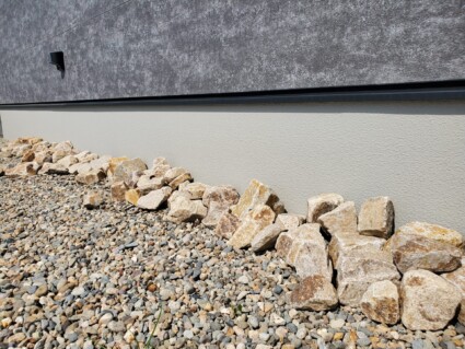 砂利だけだと単調になるのでゴロタ石でアクセントをつけて単調になりがちな基礎部分を美しく仕上げています。