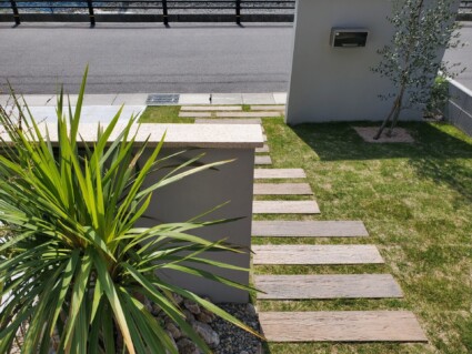 駐車場は3台確保して芝生のグリーンでスリットを設け統一感ある仕上がりです。