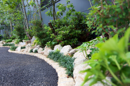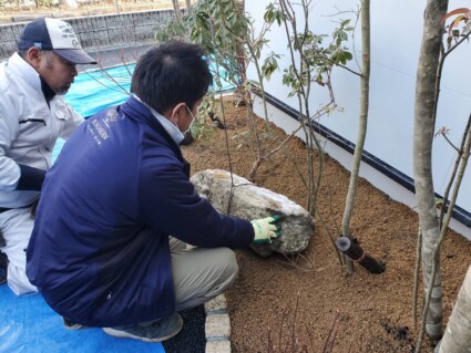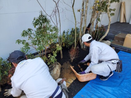 樹木だけでなく、石にも変化を付けながら雰囲気のある空間となりました。