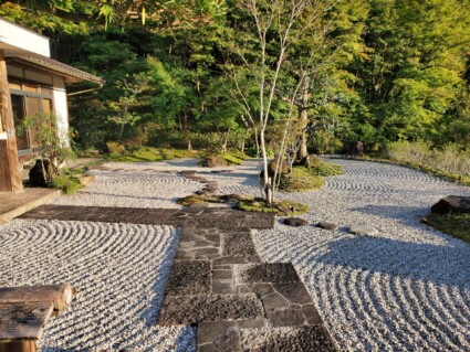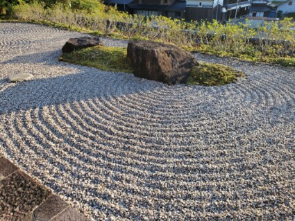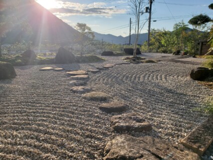 白川砂に模様をつけて枯山水の庭に仕上げています。