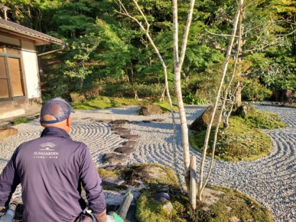 この日は、木々の剪定や白川砂の砂紋をつけて庭のメンテナンス作業でした。