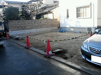 お客様の車の駐車スペースを確保、車の乗り入れがしやすいように入り口部分には土を盛っています。