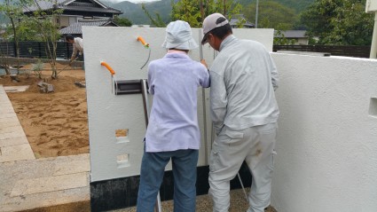 同時進行で門柱のラインや笠木やインターホン表札の取り付け