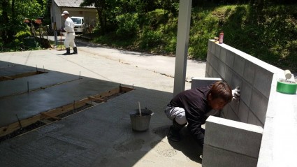 柱やブロック際など汚れた部分を刷毛で綺麗に掃除しながら