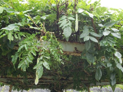 しかし山では、周囲の木々がつるを伸ばすためのいい環境をつくりだしています。写真に大きな豆のようなものが写っていますが、これは中に種子が入っています。