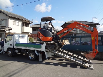 ユンボを慎重に降ろす吉田君(^^)