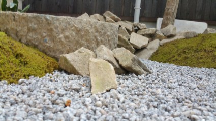 二家族を築山の島で表現し生野石が二つの島を繋ぐ架け橋に