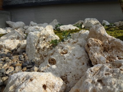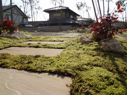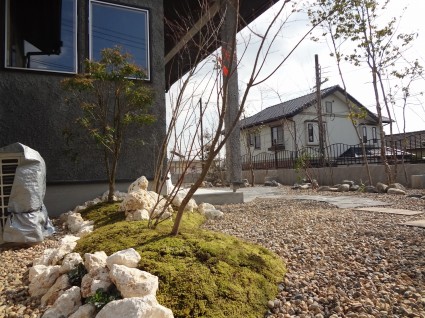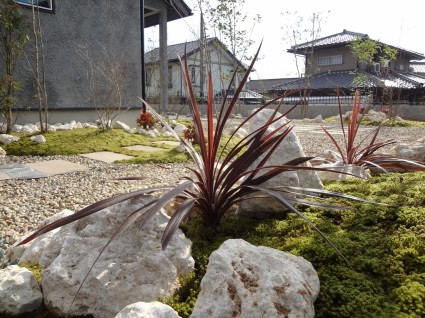 川砂利と琉球石にスナゴケのグリーンでまとめています。
