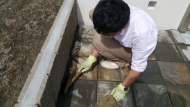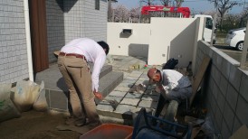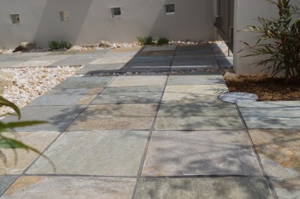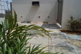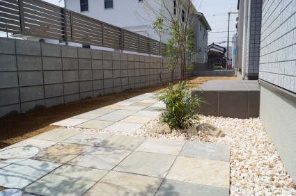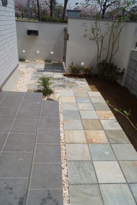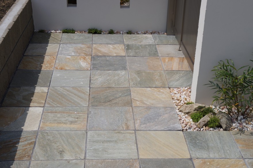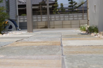 自然石のアプローチ ランダムな色むらが魅力的な300角石貼りアプローチ 姫路市