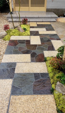 和風住宅に似合う和モダンアプローチ|玄関までの距離4mのアプローチに奥行き感をもたせたアプローチ