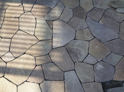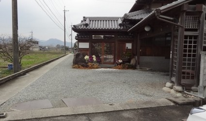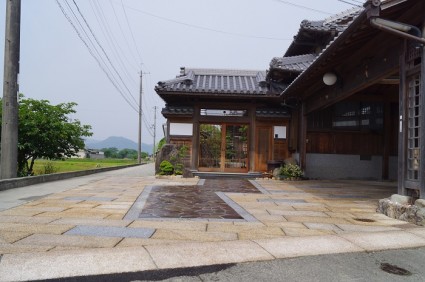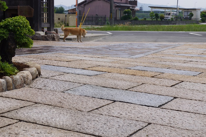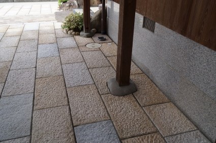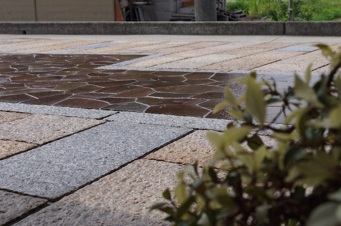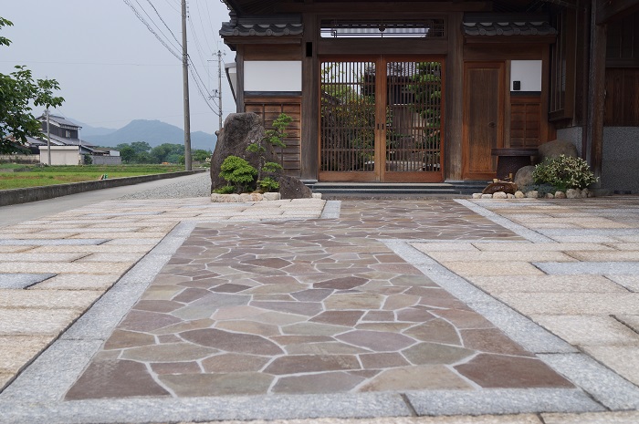 御影石の重厚で趣のある石畳に鉄平石貼りのアプローチ落ち着いた高級なイメージの玄関周りが姫路市で完成白とサビ色の御影石の板石を敷き詰めた石畳の中に自然系がきれいな鉄平石を貼り合せた本格的な和風のお庭の工事です。