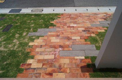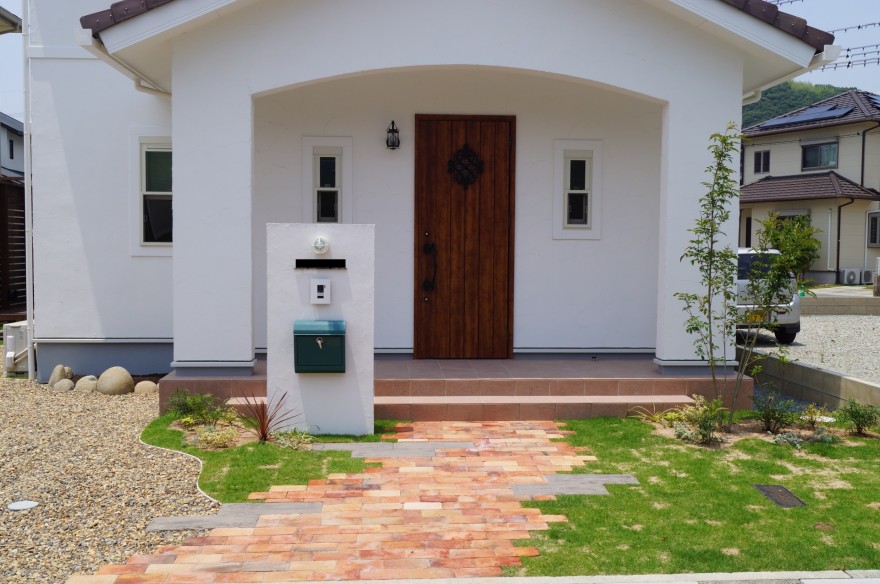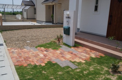 表情豊かな敷きレンガの色合いに芝生のグリーンがより引き立ててくれます。