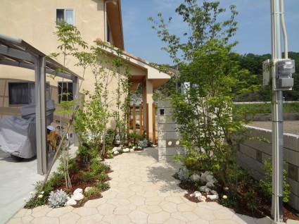 玄関先のやさしい植栽や個性的なお庭がアプローチをより引き立ててくれます。