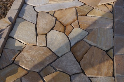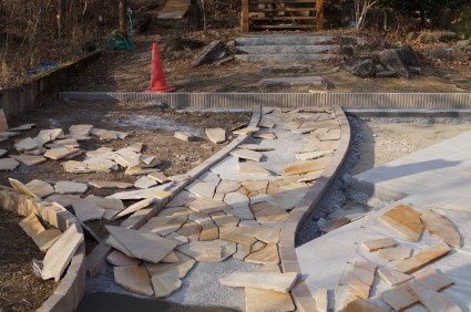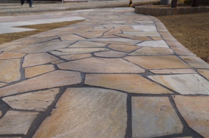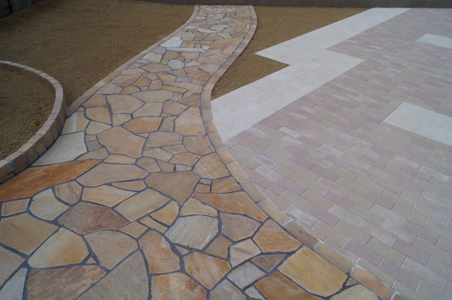 レンガで曲線に縁取りしたラインの中にイエロークォーツ自然石の乱形の石貼りをしたアプローチが完成しました、石の色幅や形がいろんな表情を楽しませてくれる高級感あるアプローチが完成しました。