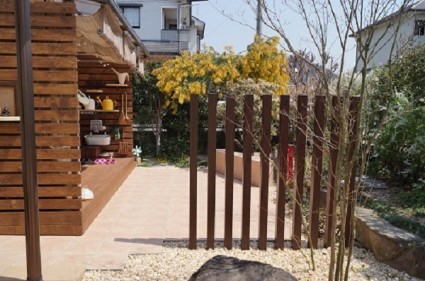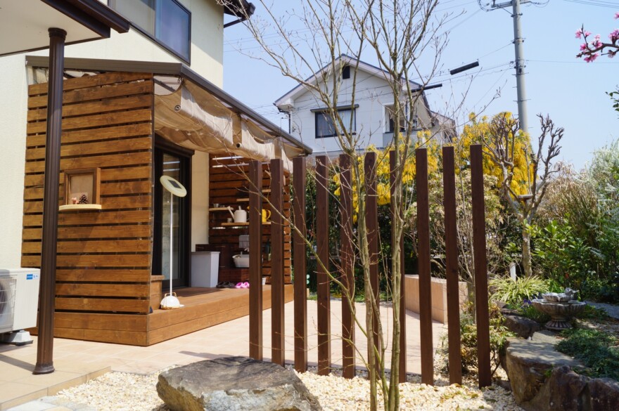 お庭のリフォームで既設のテラス屋根を利用して木の温もりを感じられる木製のウッドデッキが出来ました。家族団欒の空間に木製の目隠しフェンスや花やガーデニンググッヅをディスプレーできる棚や収納も可能な手作りのベンチもあります。