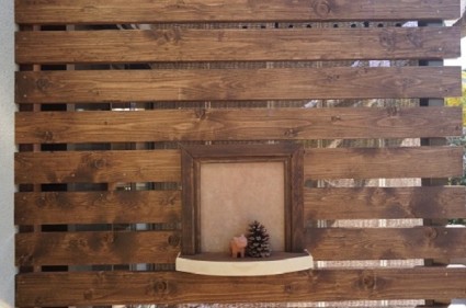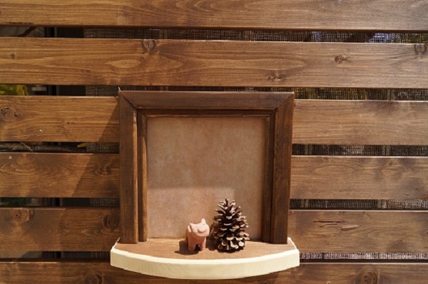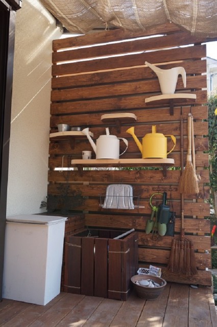 目隠しを兼ね備えた木製のフェンスの壁面に大小さまざまな形の棚を取り付けてガーデン用品を並べられるようにしています。