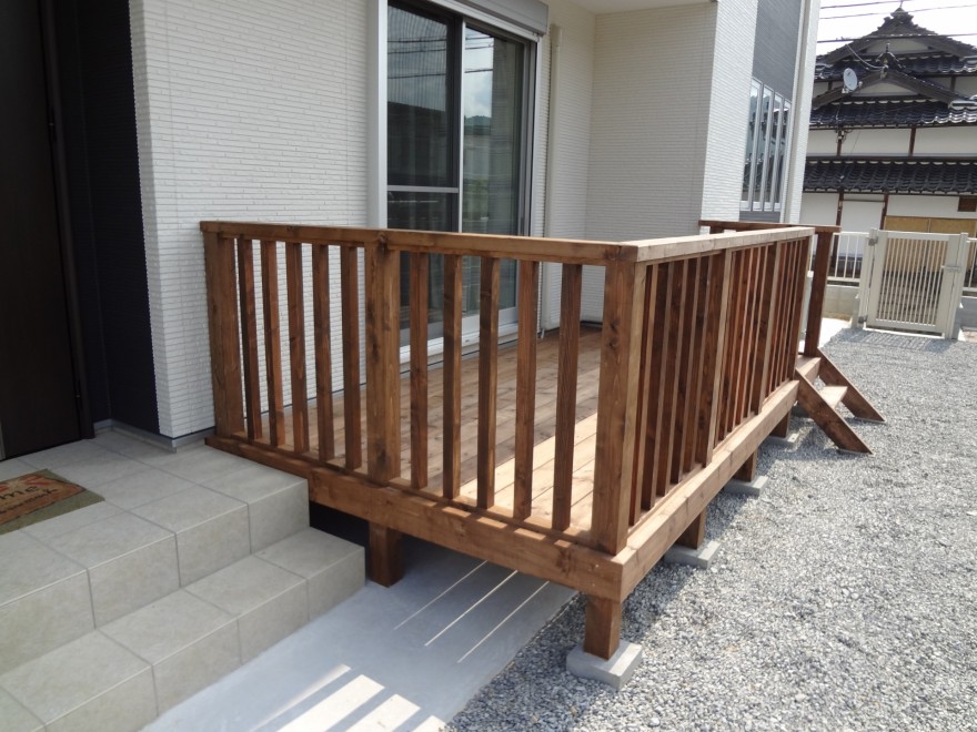 ステップも取り付けて外側からも出入りができるようにし、小さいお子様の安全を考えてフェンスを取り付けました。