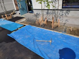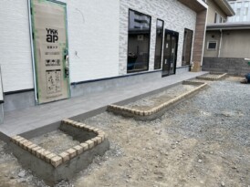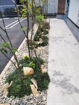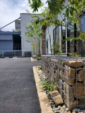 HOME外構・エクステリア・お庭の施工事例石のある庭 > 姫路市店舗前外構植栽工事|デザインユニットガビオンと自然樹形の雑木でオシャレ店舗