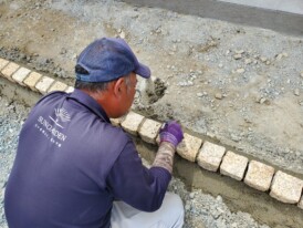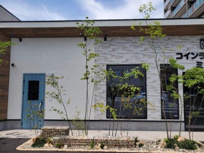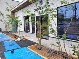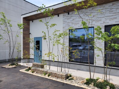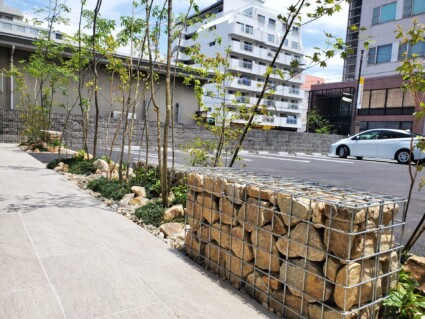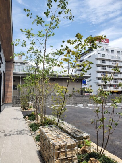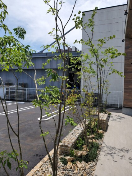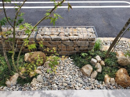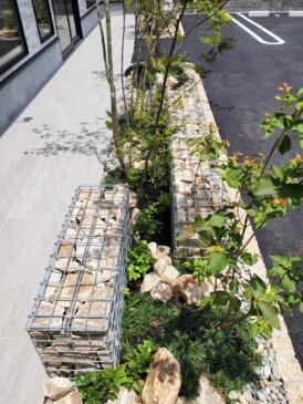 姫路市店舗前外構植栽工事|デザインユニットガビオンと自然樹形の雑木でオシャレ店舗