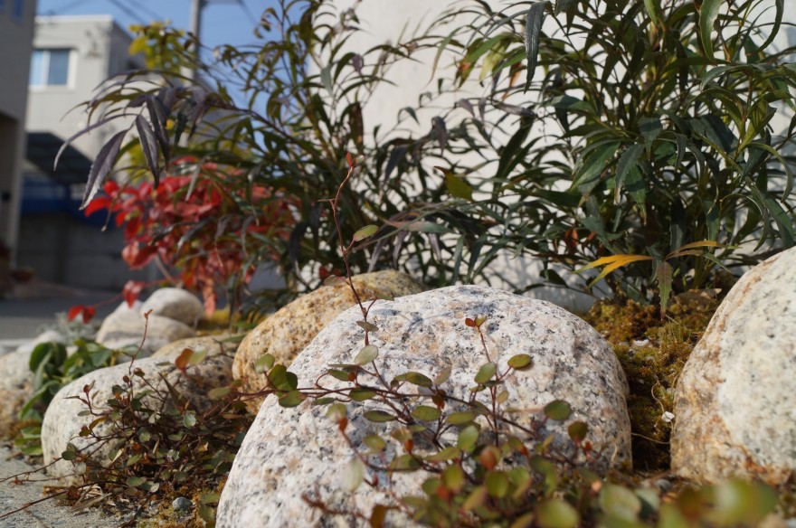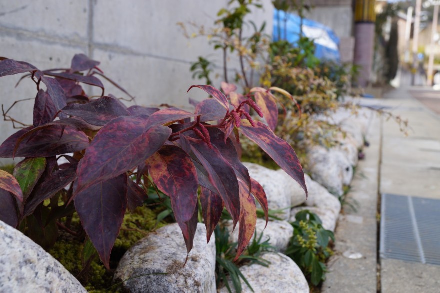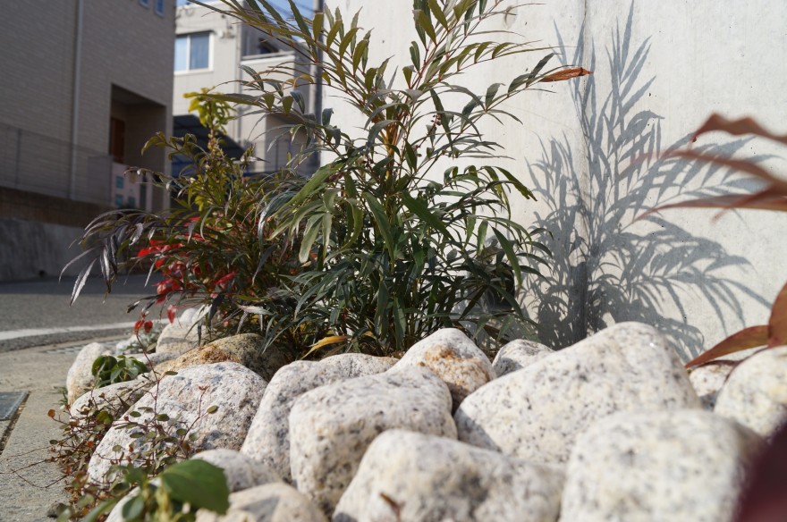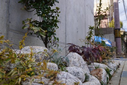 白の自然石と緑のコントラストが道行く人を楽しませてくれます。