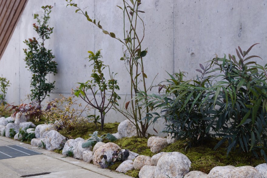 植栽にはマホニアコンフーサや姫シャリンバイ、ジンチョウゲ、ブルーベリーなどで花や実も楽しめる構成です。