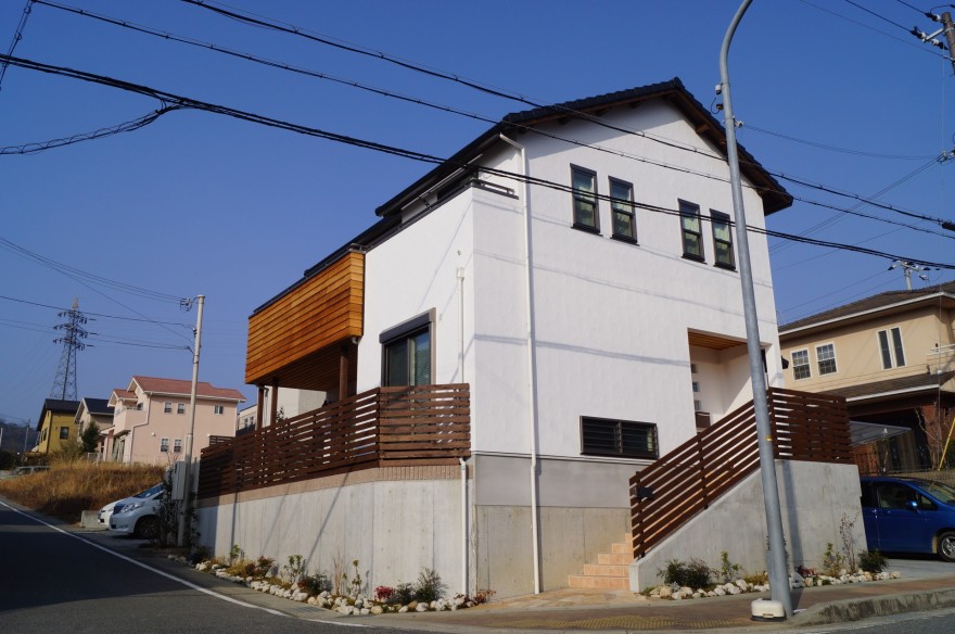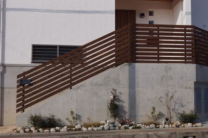 無添加住宅の漆喰の壁に木目調のウッドフェンス