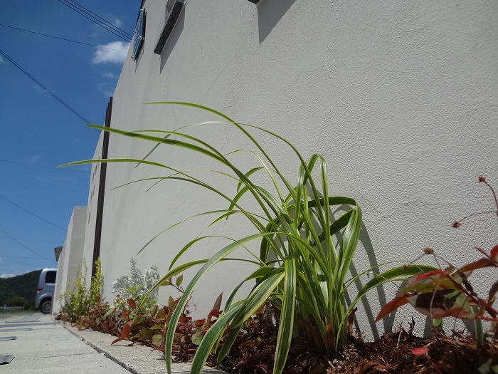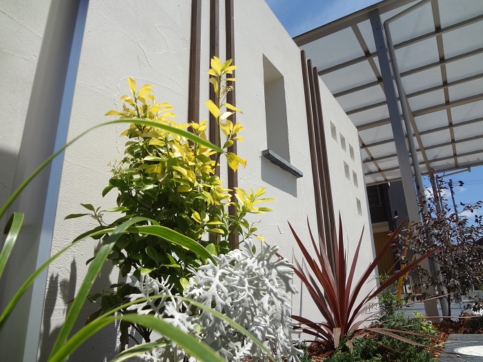 緑が映えるだけではなく塗り壁の塀もよりホワイトカラーの爽やかな印象を感じられます。