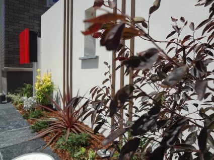 色鮮やかなおしゃれな花壇スタイリッシュな新築外構エクステリア工事に緑のスペースを設け彩り豊かな植栽や草花などの可愛らしいグリーンが映える魅力的な花壇になりました。少しのスペースでも立派に育ってくれます、背景のホワイトカラーが花壇の草花をより一層美しく感じられます。