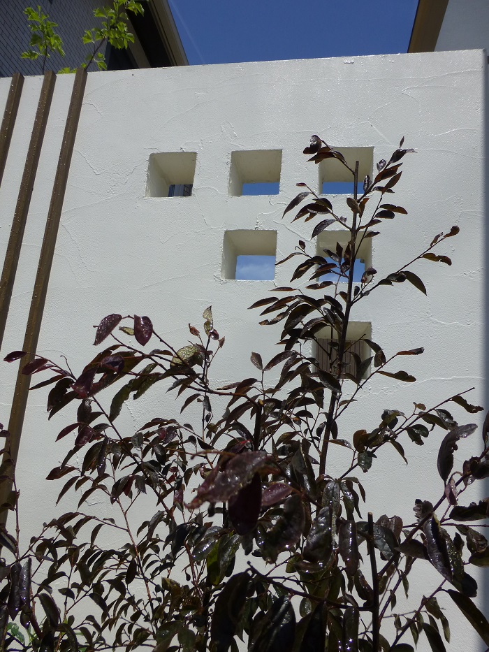 キューブのくり抜きのあるおしゃれな塗り壁にトキワマンサクが良く映えます。