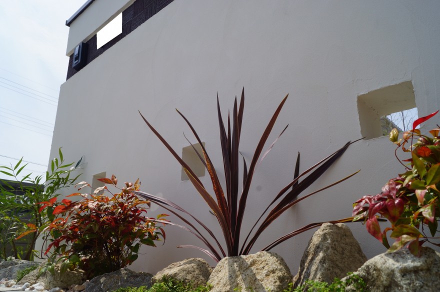 真っ白な塗り壁に植栽のカラーが良く映えて