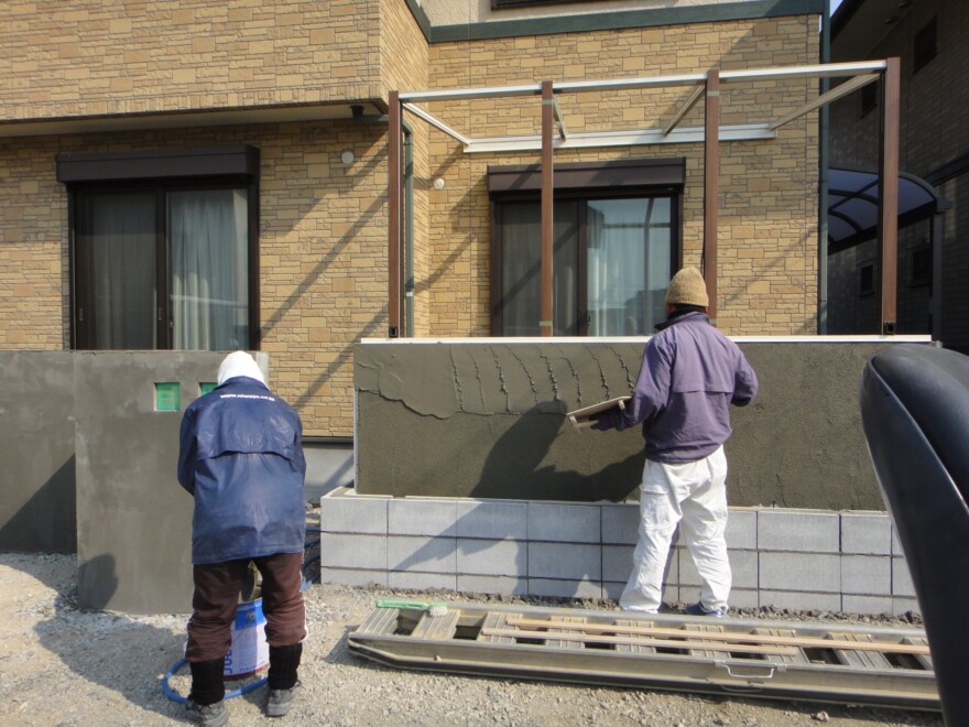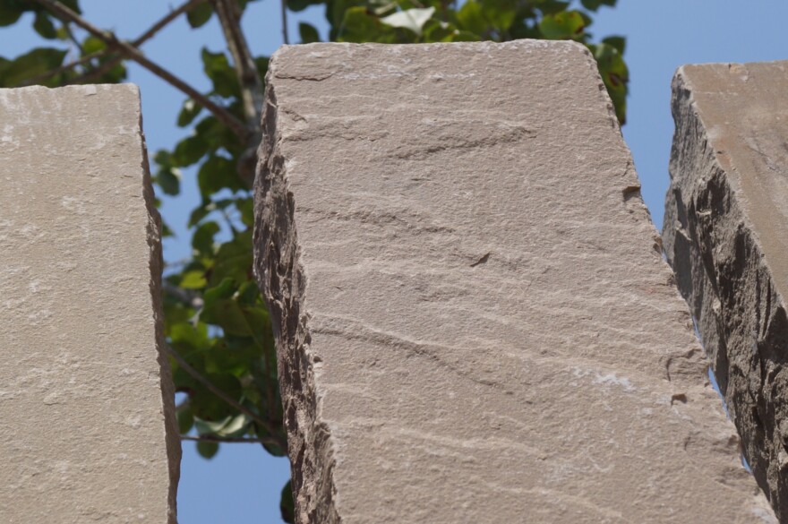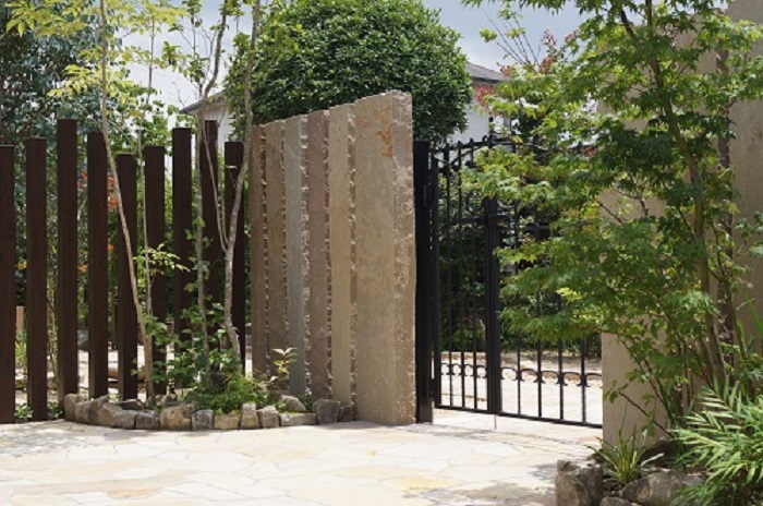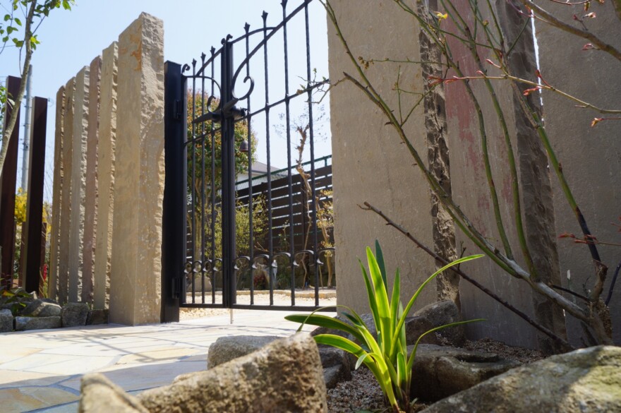重厚感あふれる石門柱はインディアンストーン(インド砂岩)石のもつ独特の表情がモダンな雰囲気を作ります。
