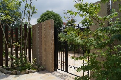モダンな石門柱にアイアンの門扉がかわいさをプラスさせ