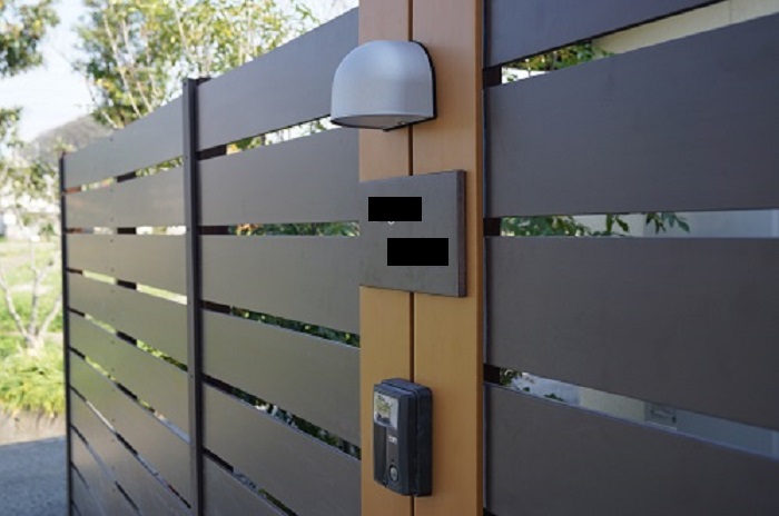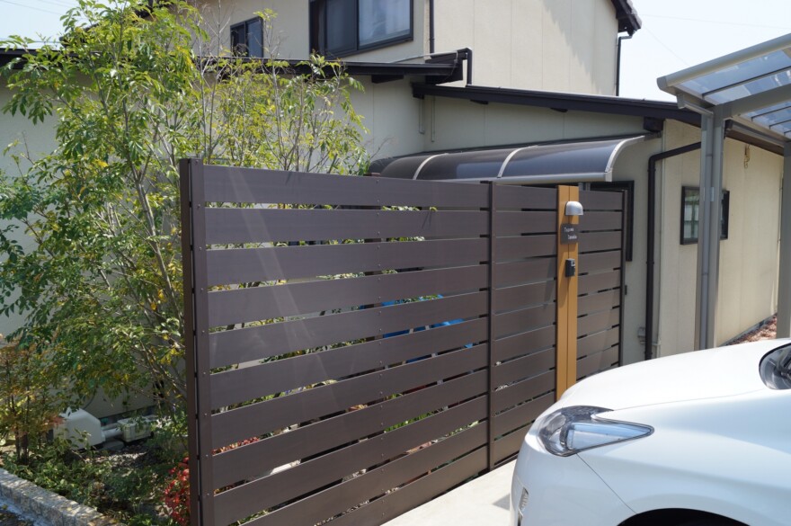 目隠しを兼ねた木目のフェンスで目線はカットされ足元もスッキリとした門周りに変身。