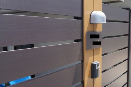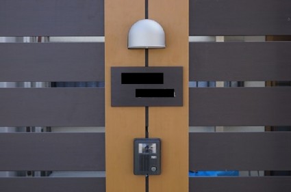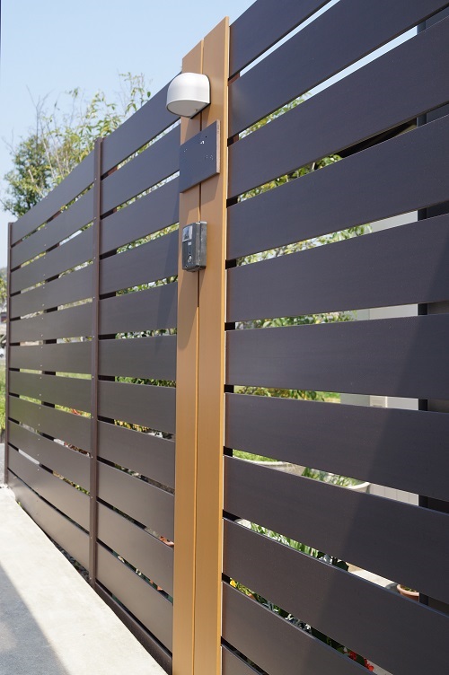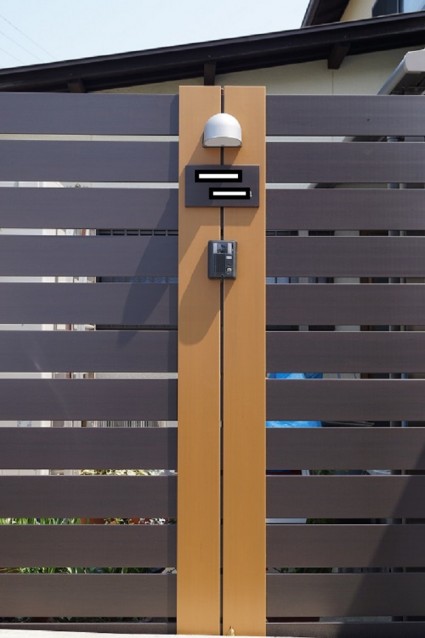木目調の腐らない素材タカショーのモクプラボートで目隠しを兼ねた門周りにダークパインとナチュラルパインの二色でアクセントをつけてオリジナルの表札やインターホンに照明を取り付けた素敵でかわいい機能性もプラスさせたナチュラルな門が姫路市で完成しました。