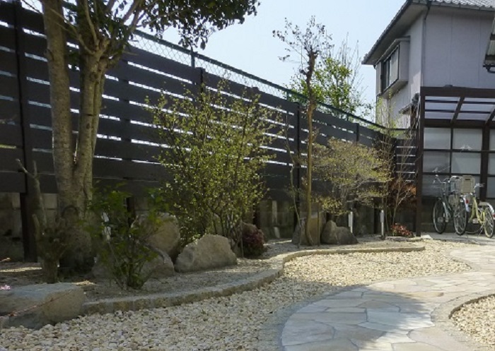 門周りのモクプラボードの目隠しとあわせ中庭部分も同じ素材で目隠しをして統一感を。