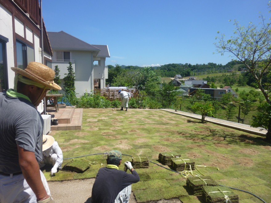 植栽と芝生はブロックや丸太で見切りをつけ管理しやすいようにしています。