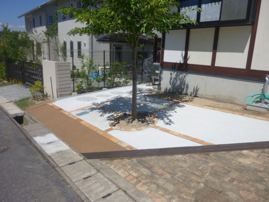 レンガでツリーを囲むように縁取りラインを入れ土間コンクリートにデザインを入れています。