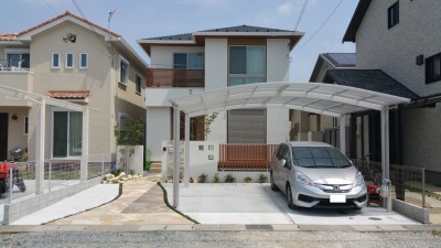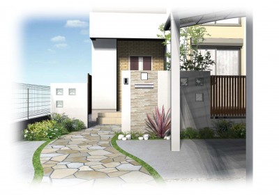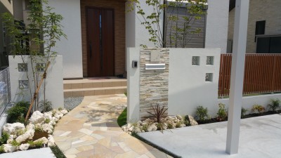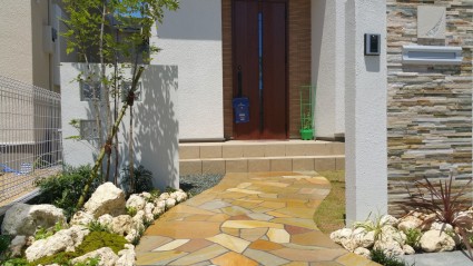 自然石貼りアプローチは緩やかな曲線で優しい雰囲気で玄関へ誘導してくれます。